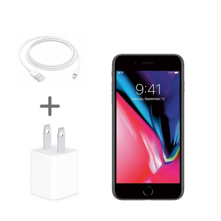 آیفون ۸ با یک کابل USB به لایتنینگ و یک آداپتور برق در جعبه عرضه میشود. کابل USB-to-Lightning برای اتصال آیفون ۸ به آداپتور شارژ استفاده میشود که سپس به پریز برق متصل میشود.