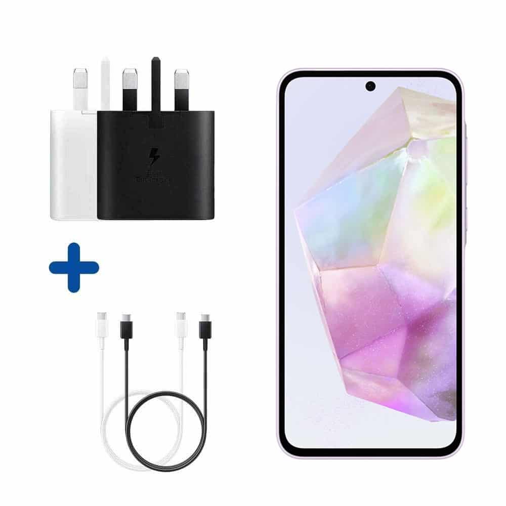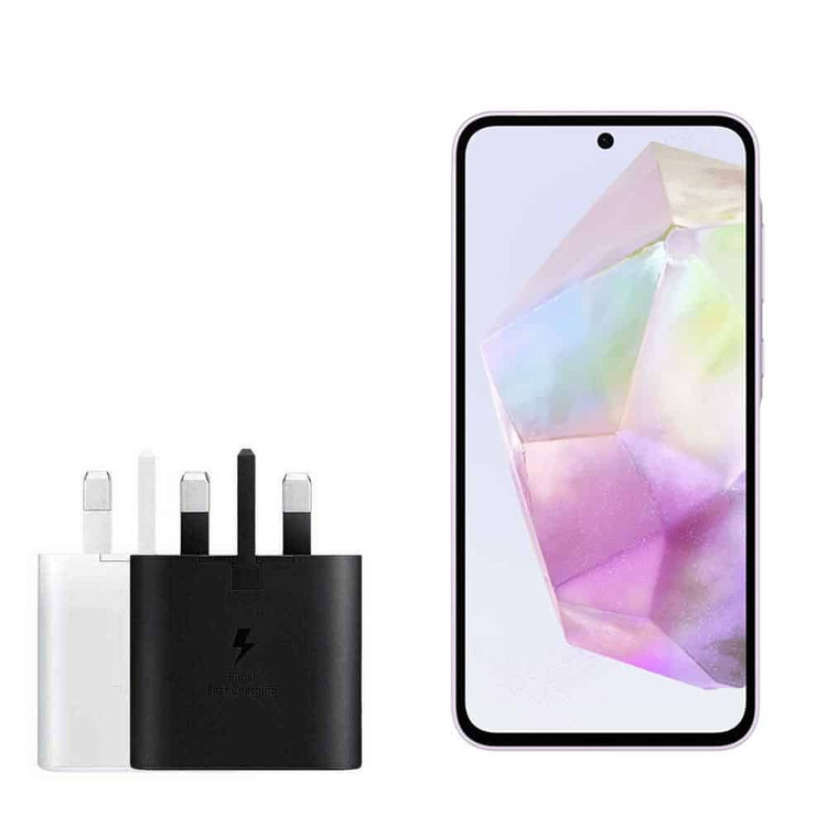 گوشی A35 سامسونگ با پردازنده Exynos 1380 و باتری ۵۰۰۰ ملی آمپری با شارژر ۲۵ وات سامسونگ سازگار است.شارژر ۲۵ واتی سامسونگ از نسل شارژرهای سوپر فست یا همان فوق سریع سامسونگ بوده که در این گوشی میتواند مورد استفاده قرار بگیرد. شارژر سوپر فست سامسونگ گلکسی A35 از شدت جریان ۳ آمپر در حالت عادی و ۵ آمپر در حالت شارژ سریع با ولتاژ ورودی ۱۰۰ تا ۲۴۰ ولت پشتیبانی مینماید.