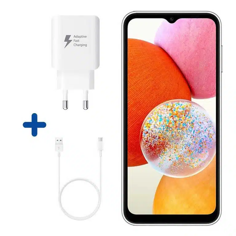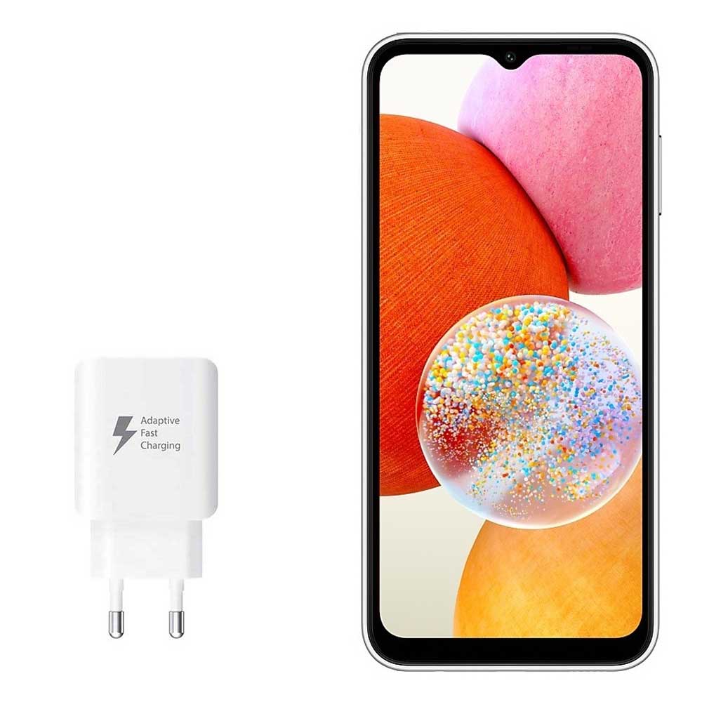 برای گوشی A14 از ۲ مدل شارژر فست سامسونگ ۱۵ وات میشه استفاده کرد. یک شارژر با کابل شارژ USB به تایپ C همراه است و شارژ دیگر همراه با کابل ۲ سر تایپ C. این انتخاب شماست که بخواهید با کدام مدل شارژر گوشی خود را شارژ کنید.صرفا استفاده از یک شارژر سریع ۱۵ وات برای گوشی A14 مهم است.