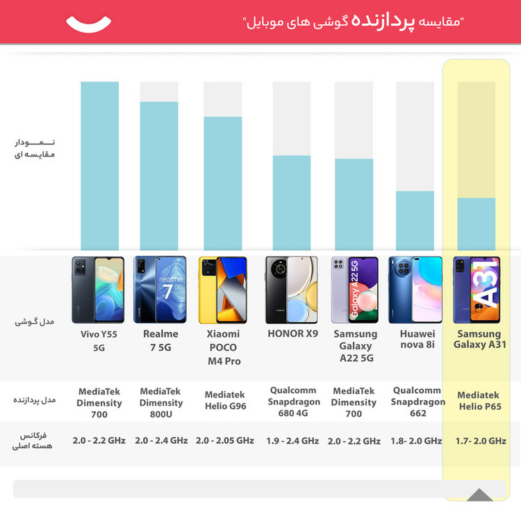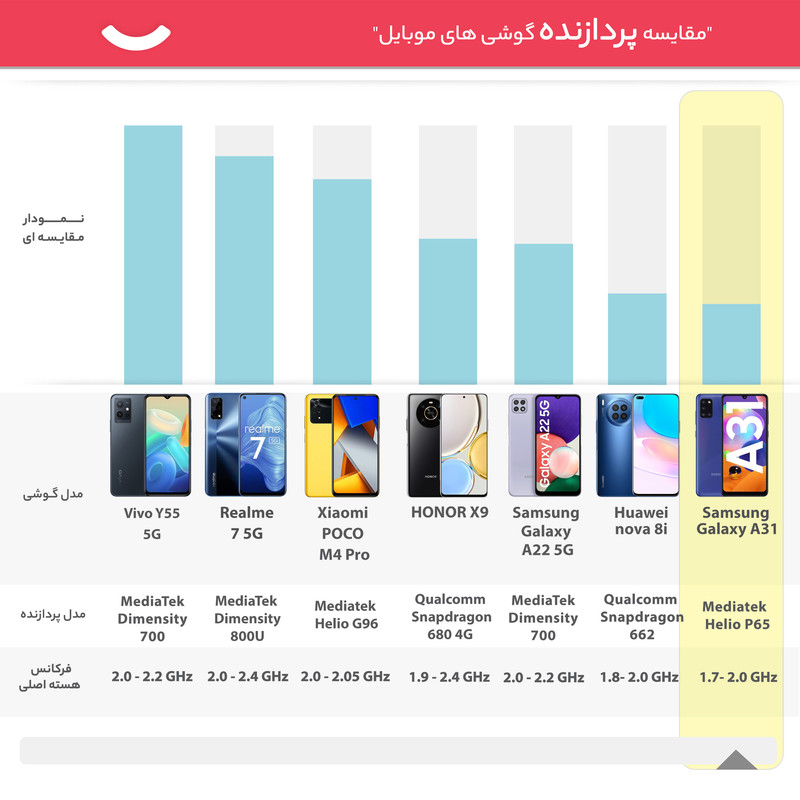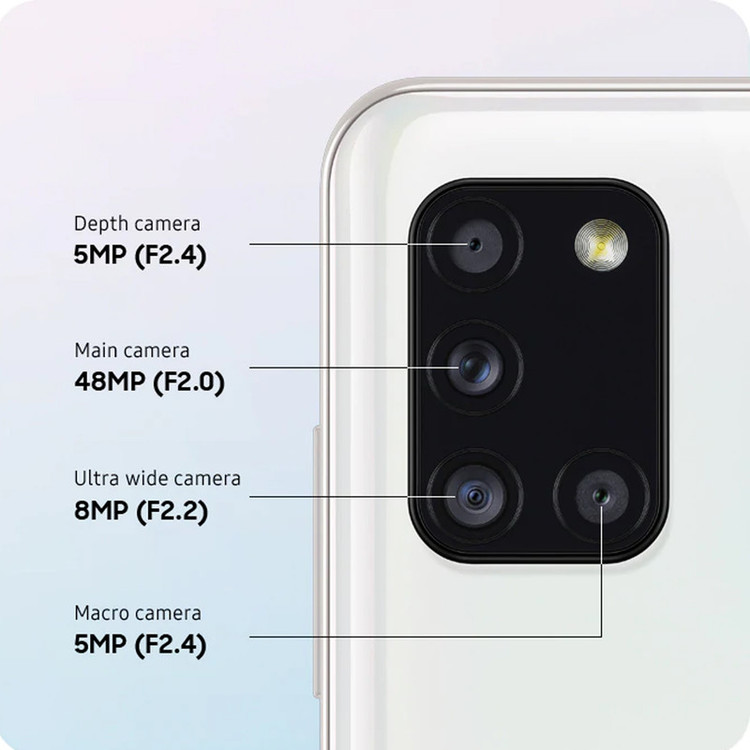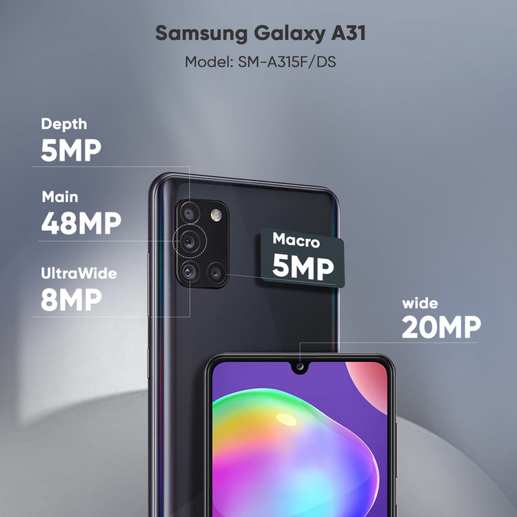 سامسونگ گوشی جدید سری A خود را با نام «A31» در تاریخ 27 آوریل 2020 معرفی کرد. این سری از تولیدات سامسونگ به داشتن صفحهنمایش بسیار با کیفیت AMOLED و دوربینهایی با امکانات بالا شهرت دارند. گوشی موبایل Galaxy A31با صفحهنمایش سوپر آمولد طراحی شده است و ظاهر هم زیبایی دارد. سامسونگ تلاش کرده است حاشیه را در این تولید جدید خود تا حد امکان کم کند. قاب جلویی آن را یک نمایشگر تمام صفحه پوشانده که البته جلوهی زیبایی هم به آن داده است. این محصول سامسونگ با جدیدترین نسخه از سیستمعامل اندروید 10 و رابط کاربری One UI 2.0 روانه بازار شده است تا از هر نظر گوشی مدرن بهحساب بیاید. صفحهنمایش استفادهشده در این گوشی 6.4 اینچ با رزولوشن 2400 در 1080 پیکسل است که با استفاده از فناوری Super AMOLED تصاویر شفاف و بینظیری را به نمایش میگذارد. این صفحهنمایش در هر اینچ 411 پیکسل را نشان میدهد . تراشهی این محصول MediaTek Helio G70 است که به همراه 6 گیگابایت رم عرضه میشود. این گوشی در ظرفیت 128 گیگابایتی عرضه شده است و با استفاده از یک کارت حافظهی جانبی قادر خواهید بود حافظه داخلی را تا یک ترابایت دیگر هم افزایش دهید. شرکت سامسونگ برای این مدل یک دوربین 4 گانه در نظر گرفته است که شامل یک لنز 48 مگاپیکسلی از نوع عریض (Wide)، یک لنز 8 مگاپیکسلی از نوع فوقعریض (Ultrawide) و دو لنز 5 مگاپیکسلی از نوع ماکرو سنسورعمق است. دوربین سلفی 20 مگاپیکسلی هم در قاب جلویی این گوشی به کار گرفته شده است. باتری 5000 میلیآمپرساعتی، پشتیبانی از فناوری شارژ سریع 15 واتی، درگاه USB Type-C و حسگر اثرانگشت زیر صفحهنمایش هم از دیگر ویژگیهای این تازهوارد است. سامسونگ این گوشی با طراحی کاملاً مطلوب و امکانات فراوان به بازار عرضه کرده است تا در بازار میانردهها هم حرفی برای گفتن داشته باشد.