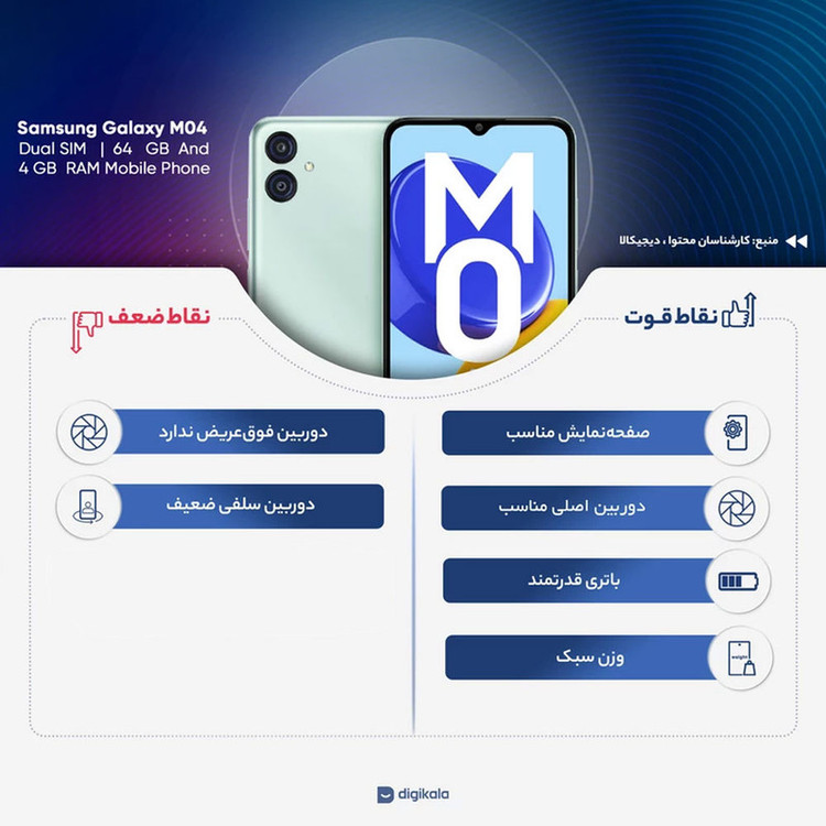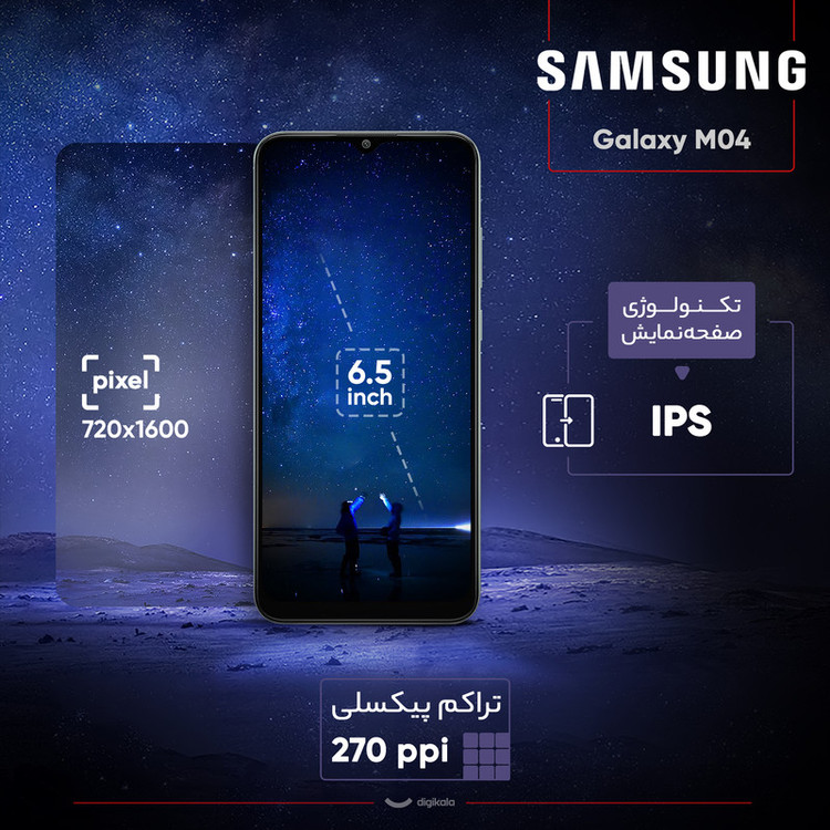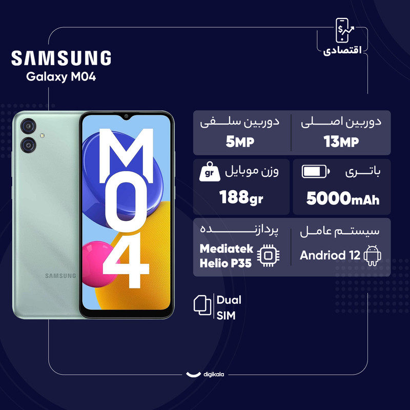 گوشیهای میانرده همواره با توجه به قیمت مقرون بهصرفه و مشخصات فنی مناسب، طرفداران بسیاری دارند و سامسونگ در این زمینه محصولات متنوع و جذابی را وارد بازار کرده که گوشی موبایل سامسونگ مدل Galaxy M04 یکی از آنها است. این گوشی به صفحهنمایش با ابعاد 6.5 اینچ و رزولوشن 720×1600 پیکسل مجهز شده که عملکردی قابل قبول در حد و اندازه یک گوشی اقتصادی را ارائه میکند. در قسمت پشتی هم یک سنسور دوربین اصلی با رزولوشن 13 مگاپیکسل و دوربین 2 مگاپیکسل از نوع سنجش عمق در نظر گرفته شده است. برای ثبت تصاویر مناسب در نور روز، میتوانید روی سنسور دوربین اصلی این گوشی حساب باز کنید. دوربین سلفی 5 مگاپیکسل هم برای ثبت تصاویر معمولی در نور روز عملکرد مناسبی دارد. در بخش مشخصات سختافزاری، Galaxy M04 به پردازنده هلیو P35 شرکت مدیاتک مجهز شده و در اجرای بازیهای محبوب و نرمافزارهای کاربردی، عملکرد مناسب و قابل قبولی دارد. باتری با میزان ظرفیت 5000 میلیآمپرساعت این گوشی هم به ازای هر بار شارژ صد درصدی، توانایی ارائه زمان آماده بهکار نزدیک به دو روز را دارد. در مجموع باید بگوییم که اگر به دنبال خرید گوشی اقتصادی هستید که در کناری قیمت مقرون بهصرفه، از مشخصات مناسبی بهره برده باشد که در فعالیتهای روزمره عملکرد خوبی داشته باشد، سامسونگ Galaxy M04 میتواند یکی از گزینههای مناسب برای شما باشد. گوشیهای اکتیو هم به این شکل هستند که به دلیل محدودیتهای برخی از محصولات برای کشور ایران، در کشورهای همسایه بهصورت رسمی با یک بار قرار گرفتن سیمکارت، اکتیو شده تا امکان استفاده در کشور وجود داشته باشد و پلمپ میشوند و باید بدانید که این پروسه هیچ مشکلی در راستای گارانتی کالا بههمراه ندارد.
